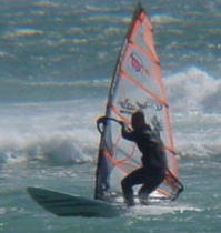 A NorioJibeで、ラフする。 この時 単純にブームエンド下げると後ろ足加重になってしまう。 そこで「踵(かかと)」に乗ると、バックサイドに板が動く! ※フロント or ジャイブの場合は 「踵(かかと)」ではなく、「つま先」に乗れば良い。 |
